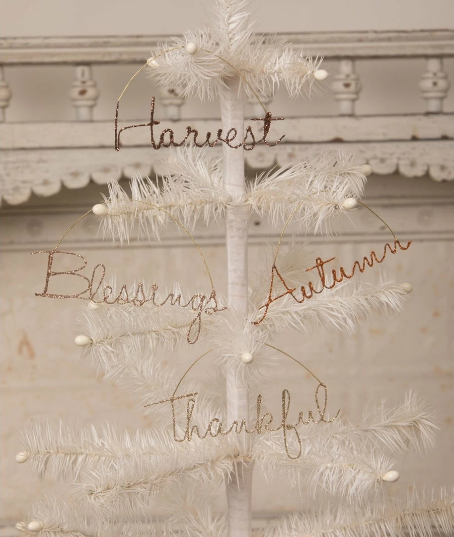 Create a memorable atmosphere for your fall celebrations with gratitude glittered cursive wire word ornaments.