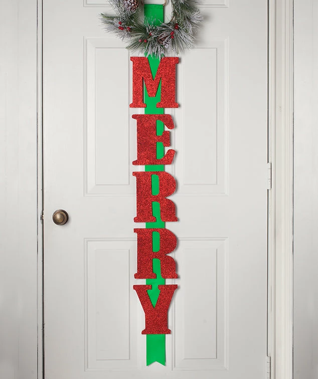 Greet your guests with merriment with this festive red and green Merry Door Hanger.