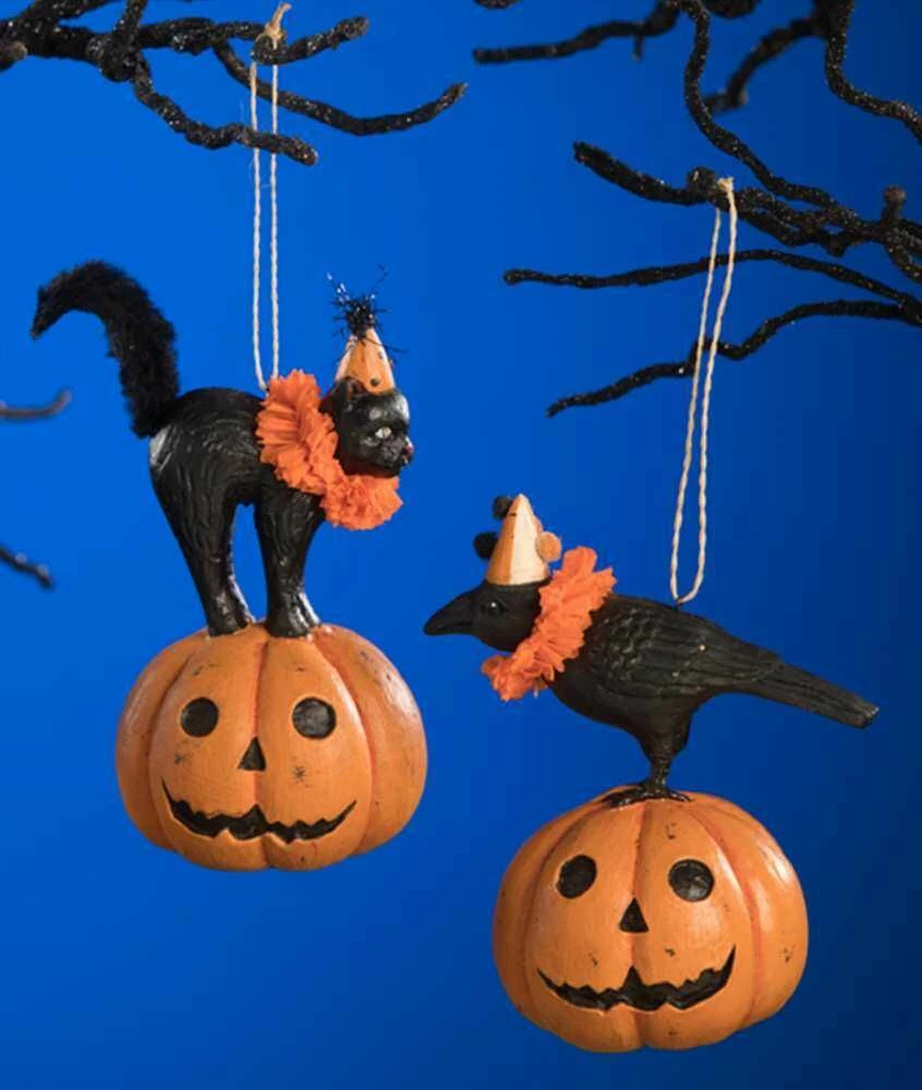 Get in the Halloween spirit with these black and orange Party Cat and Crow on Pumpkin Ornaments.