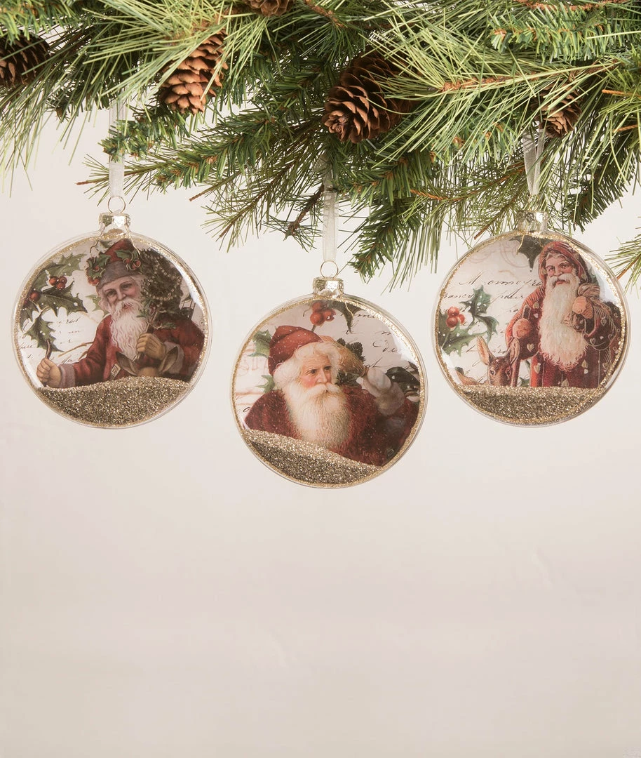 Create a cozy Christmas atmosphere with these Vintage Santa & Holly Glass Disc Ornaments designed by Bethany Lowe Designs.