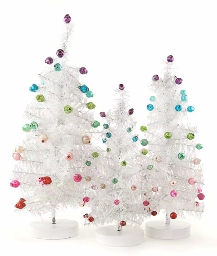 Quickly create a festive atmosphere with these white tinsel trees decorated with colorful glass beads.