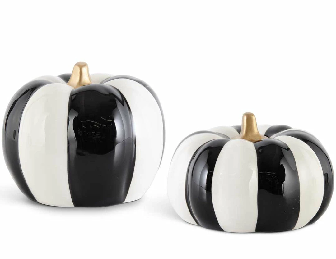 Bring designer style to your Halloween decorating with these with striking Black & White Striped Pumpkins with Gold Stems