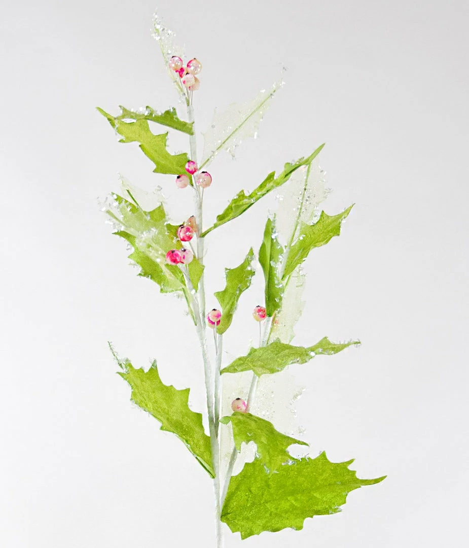 Katherine’s Collection Iced Holly Spray, Lime Green Leaves And Pink Berries – Set Of 3