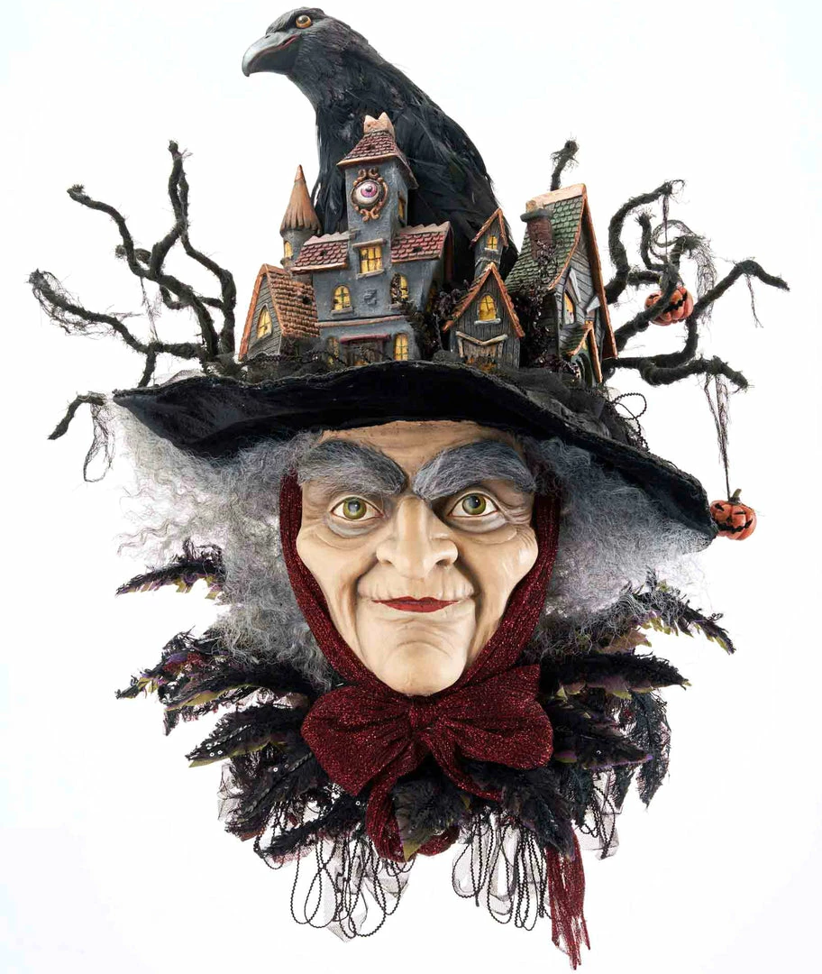 Seemingly straight out of a movie set, Which Way to Witchville Witch Wall Piece is an impressive Halloween statement piece that will keep the big, and small ghouls and goblins mesmerized. Discover a haunted village nestled in her hat and a scheming raven that’s up to no good—an amazingly detailed piece for the discerning Halloween collector.