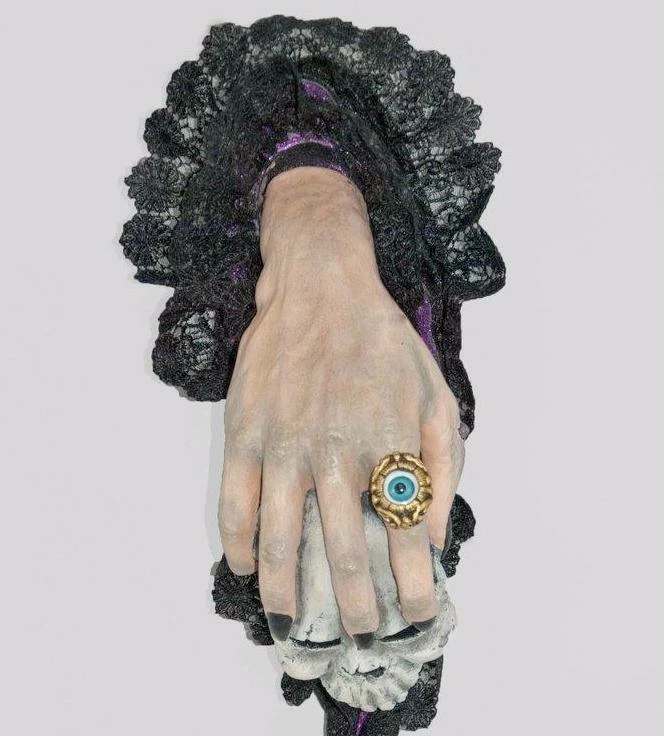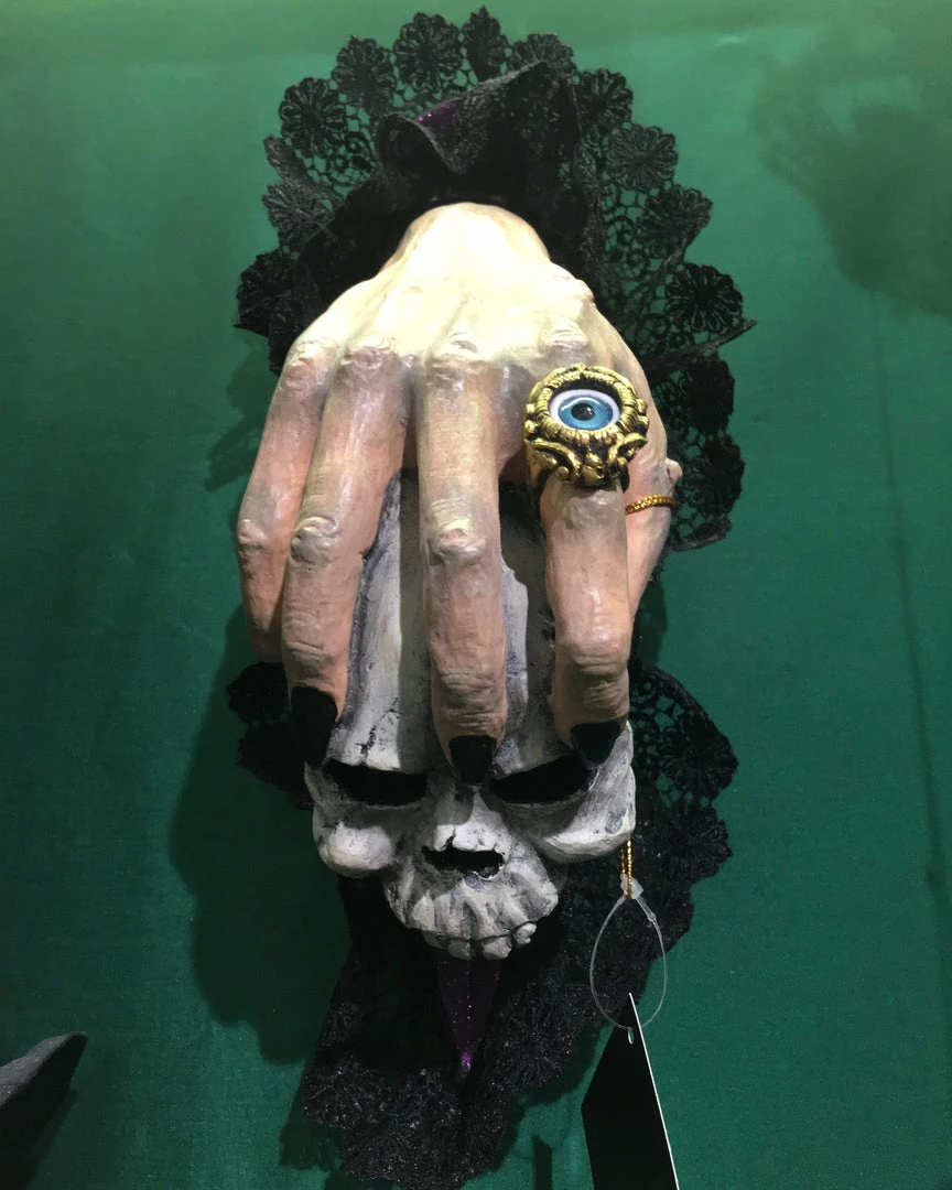 Make a wicked first impression by greeting your Halloween guests with this Witches Hand & Skull Door Knocker. They’ll get the evil eye if they dare knock at your door! Masterfully hand-painted with realistic flesh like detail. Haunting Victorian black lace, creepy evil eye ring and an artfully shaded skull bring this supernatural door knocker to life.
