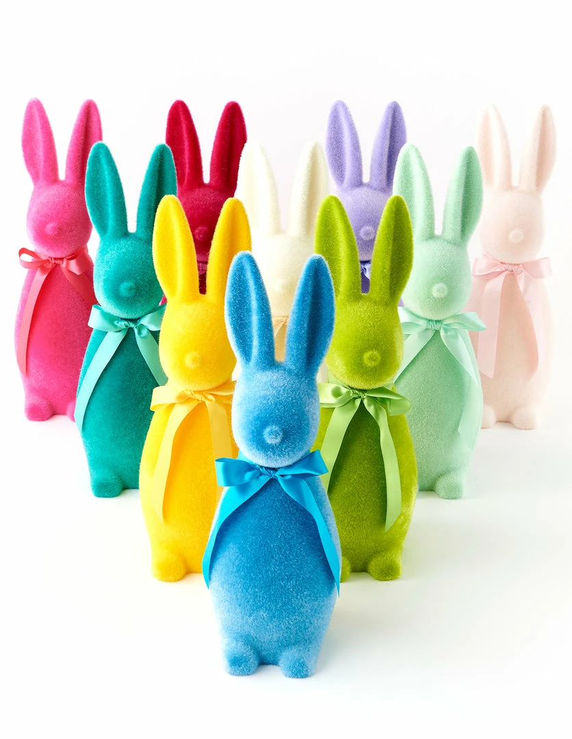 Hop, hop, hop! Say, “Happy Easter” with these playful Pop of Color Flocked Bunny Rabbits, finished off with a satin ribbon.